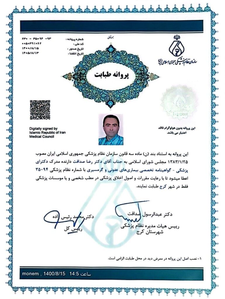 دکتر رضا صداقت با 30 سال تجربه تخصصی در تشخیص، درمان و پیشگیری از بیماریهای عفونی، یکی از پزشکان برجسته در این حوزه در شهر کرج به شمار میرود. ایشان با بهرهگیری از دانش روز پزشکی و اخلاقمدار، تاکنون بیماران بیشماری را در زمینههای مختلف درمانی یاری رسانده است.